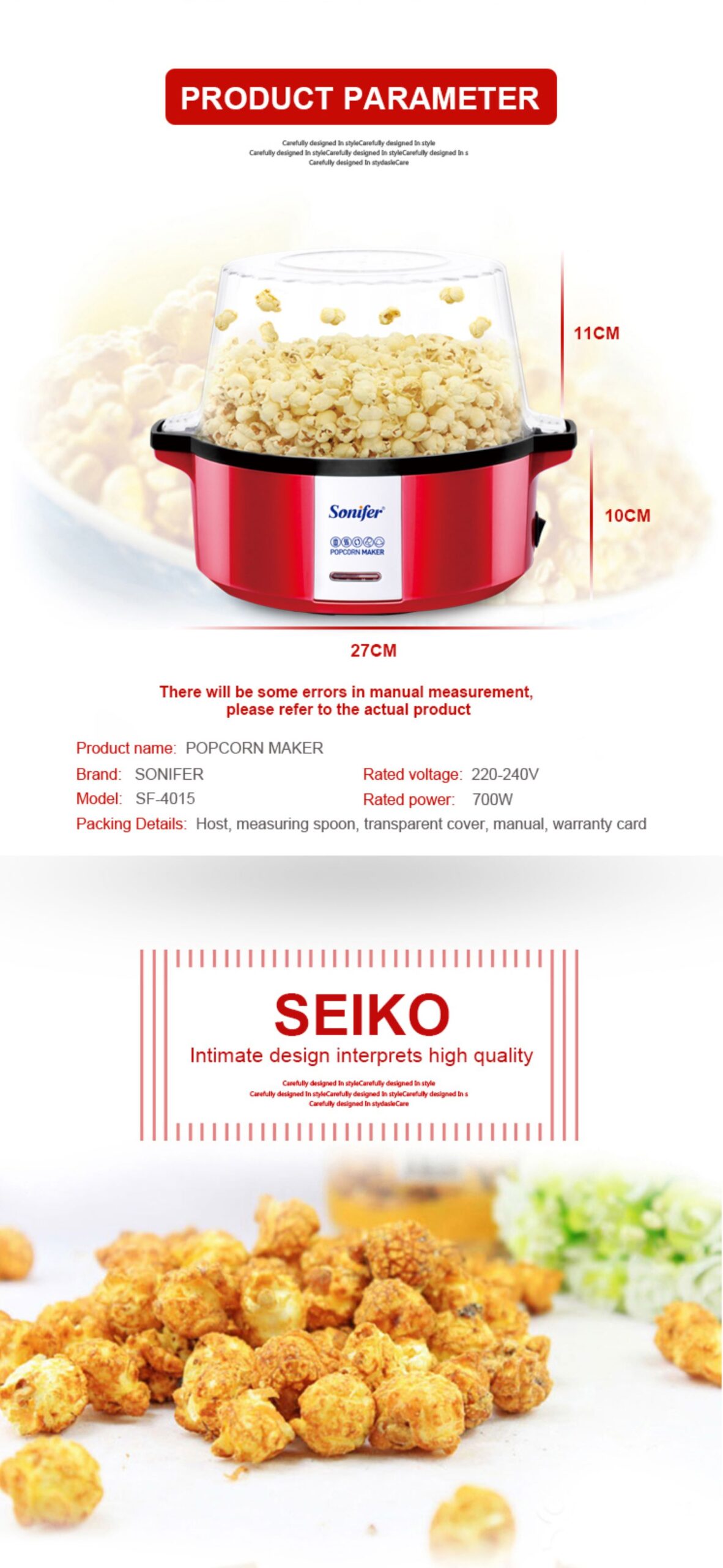 Popkornų aparatas Sonifer SF-4015 – skaidrus dangtis ir non-stick paviršius